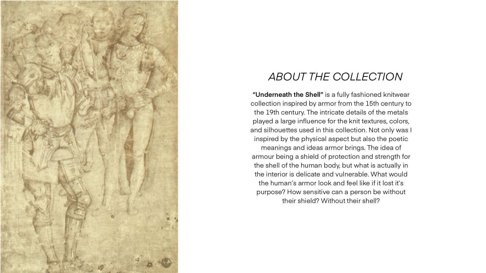 "Underneath the Shell" is a fully fashioned knitwear collection inspired by armor from the 15th-19th century.